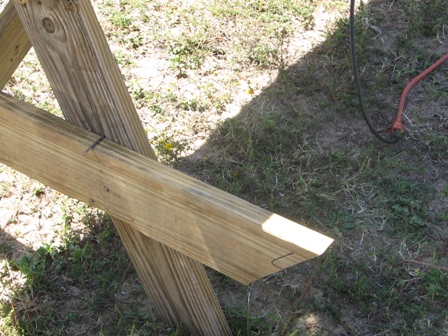 4. Coloca las tablas de 88.9 centímetros de 2x6 para que queden centradas en el punto más corto de los rieles de la mesa y clávalas, mira la foto para guiarte.